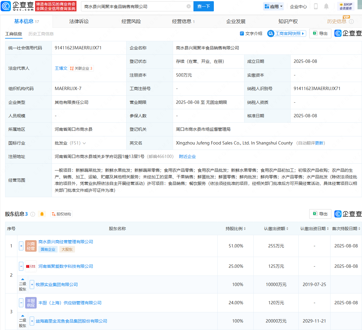 近日,商水县兴周聚丰食品销售有限公司成立,法定代表人为王博文,经营范围包含:新鲜蔬菜批发;新鲜水果批发;食用农产品零售;食用农产品批发;食用农产品初加工;初级农产品收购等。企查查股权穿透显示,该公司由商水县兴商经营管理有限公司、牧原实业集团有限公司旗下河南省聚爱数字科技有限公司、金龙鱼(300999)旗下丰厨(上海)供应链管理有限公司共同持股。